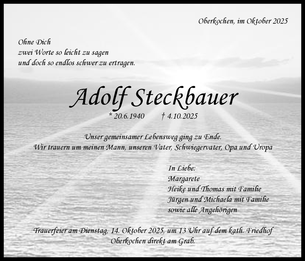 Hier finden Sie alle Traueranzeigen aus der Zeitung, die bisher für Adolf Steckbauer erschienen sind. Weitere Traueranzeigen, die in der Zeitung erscheinen, werden hier ebenfalls aufgelistet