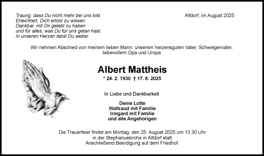 Hier finden Sie alle Traueranzeigen aus der Zeitung, die bisher für Albert Mattheis erschienen sind. Weitere Traueranzeigen, die in der Zeitung erscheinen, werden hier ebenfalls aufgelistet