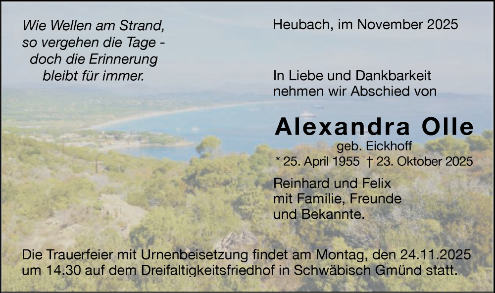 Hier finden Sie alle Traueranzeigen aus der Zeitung, die bisher für Alexandra Olle erschienen sind. Weitere Traueranzeigen, die in der Zeitung erscheinen, werden hier ebenfalls aufgelistet
