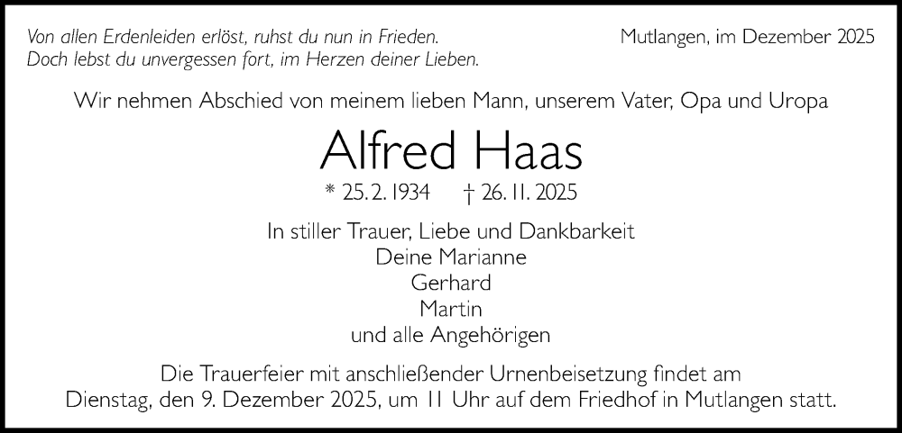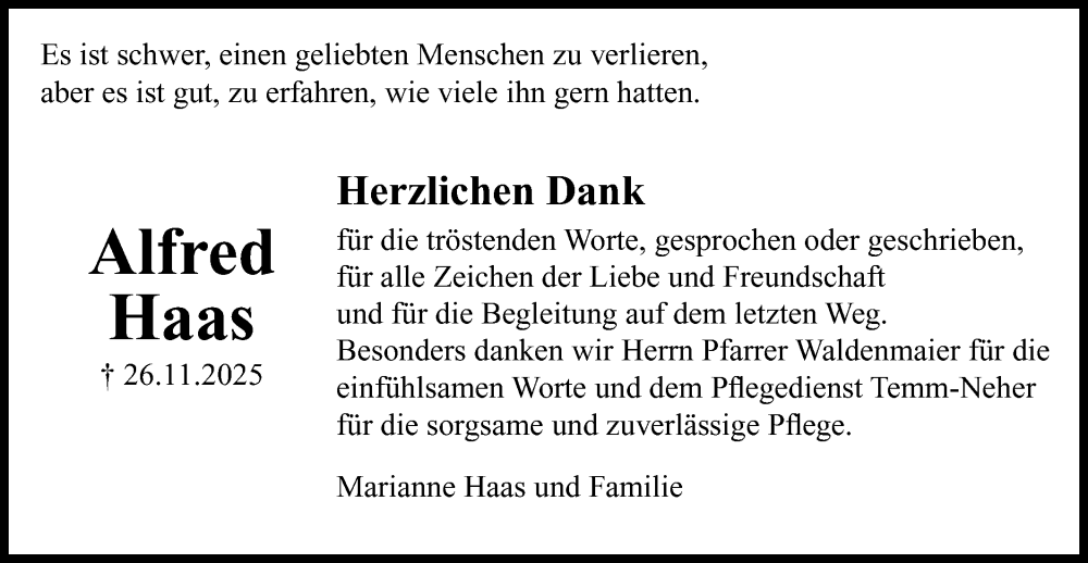 Hier finden Sie alle Traueranzeigen aus der Zeitung, die bisher für Alfred Haas erschienen sind. Weitere Traueranzeigen, die in der Zeitung erscheinen, werden hier ebenfalls aufgelistet