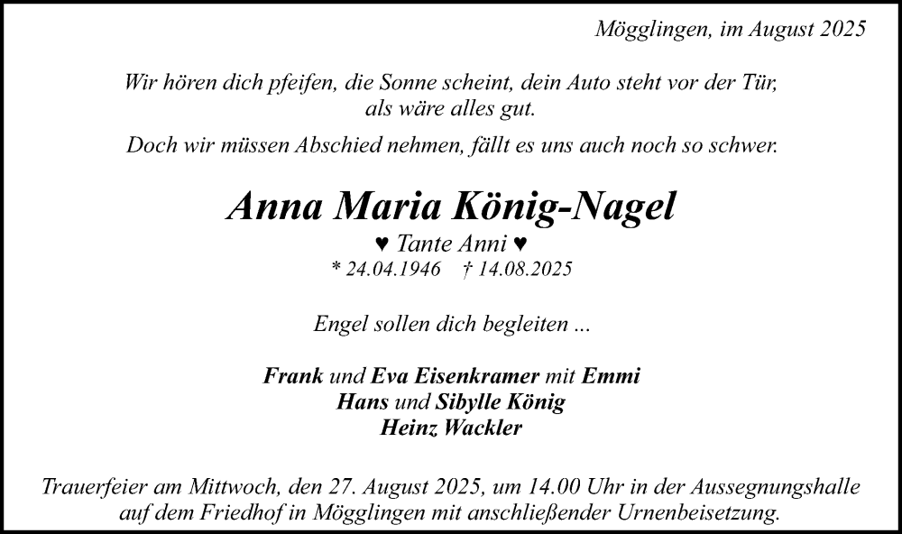 Hier finden Sie alle Traueranzeigen aus der Zeitung, die bisher für Anna Maria König-Nagel erschienen sind. Weitere Traueranzeigen, die in der Zeitung erscheinen, werden hier ebenfalls aufgelistet