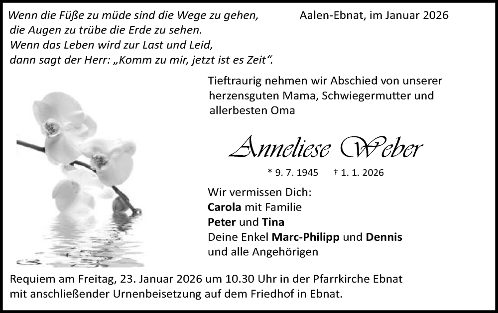 Hier finden Sie alle Traueranzeigen aus der Zeitung, die bisher für Anneliese Weber erschienen sind. Weitere Traueranzeigen, die in der Zeitung erscheinen, werden hier ebenfalls aufgelistet