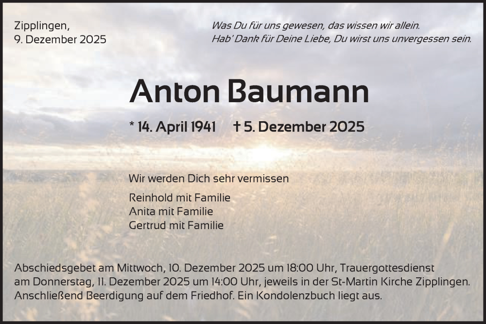 Hier finden Sie alle Traueranzeigen aus der Zeitung, die bisher für Anton Baumann erschienen sind. Weitere Traueranzeigen, die in der Zeitung erscheinen, werden hier ebenfalls aufgelistet