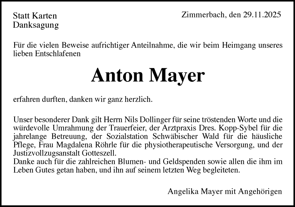 Hier finden Sie alle Traueranzeigen aus der Zeitung, die bisher für Anton Mayer erschienen sind. Weitere Traueranzeigen, die in der Zeitung erscheinen, werden hier ebenfalls aufgelistet