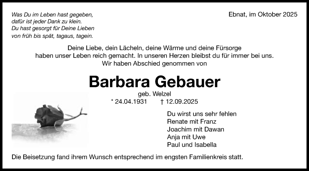 Hier finden Sie alle Traueranzeigen aus der Zeitung, die bisher für Barbara Gebauer erschienen sind. Weitere Traueranzeigen, die in der Zeitung erscheinen, werden hier ebenfalls aufgelistet