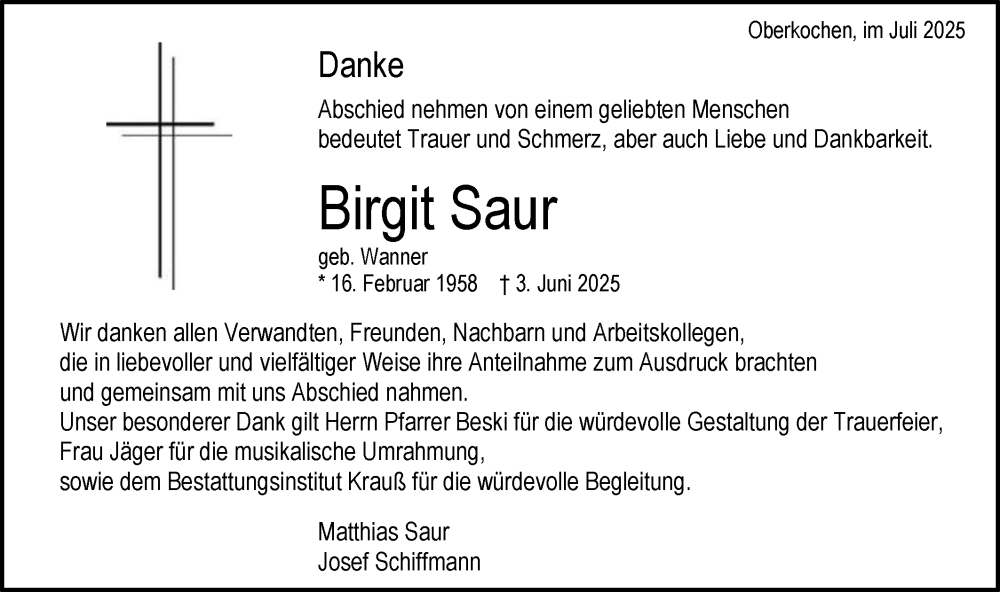 Hier finden Sie alle Traueranzeigen aus der Zeitung, die bisher für Birgit Saur erschienen sind. Weitere Traueranzeigen, die in der Zeitung erscheinen, werden hier ebenfalls aufgelistet