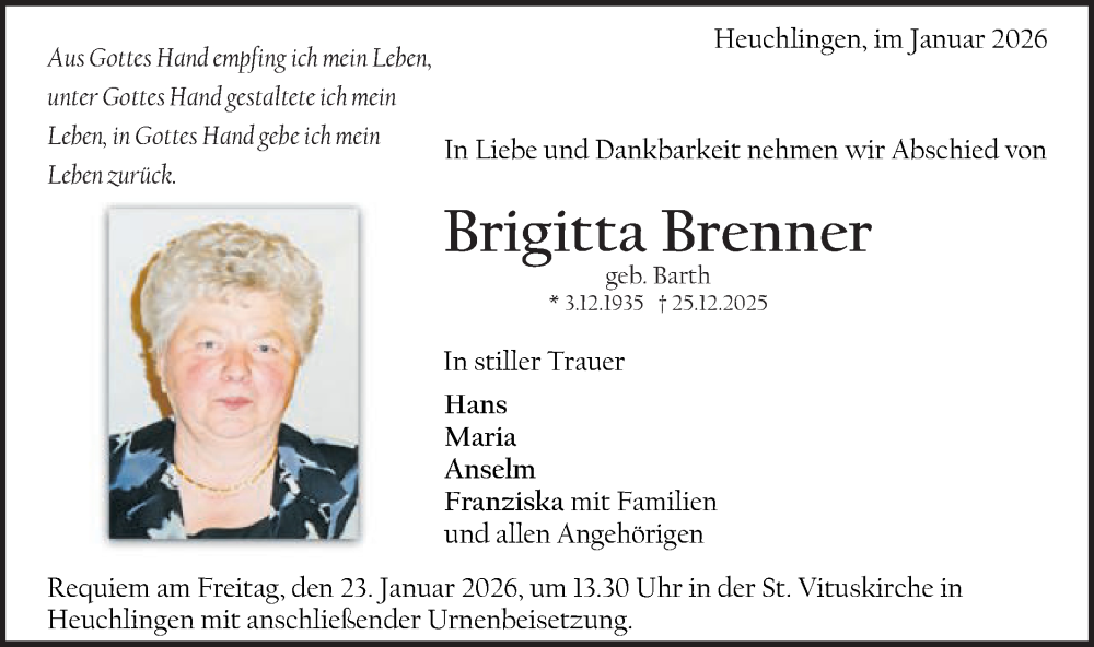 Hier finden Sie alle Traueranzeigen aus der Zeitung, die bisher für Brigitta Brenner erschienen sind. Weitere Traueranzeigen, die in der Zeitung erscheinen, werden hier ebenfalls aufgelistet