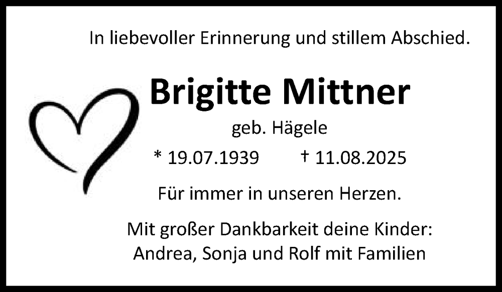 Hier finden Sie alle Traueranzeigen aus der Zeitung, die bisher für Brigitte Mittner erschienen sind. Weitere Traueranzeigen, die in der Zeitung erscheinen, werden hier ebenfalls aufgelistet