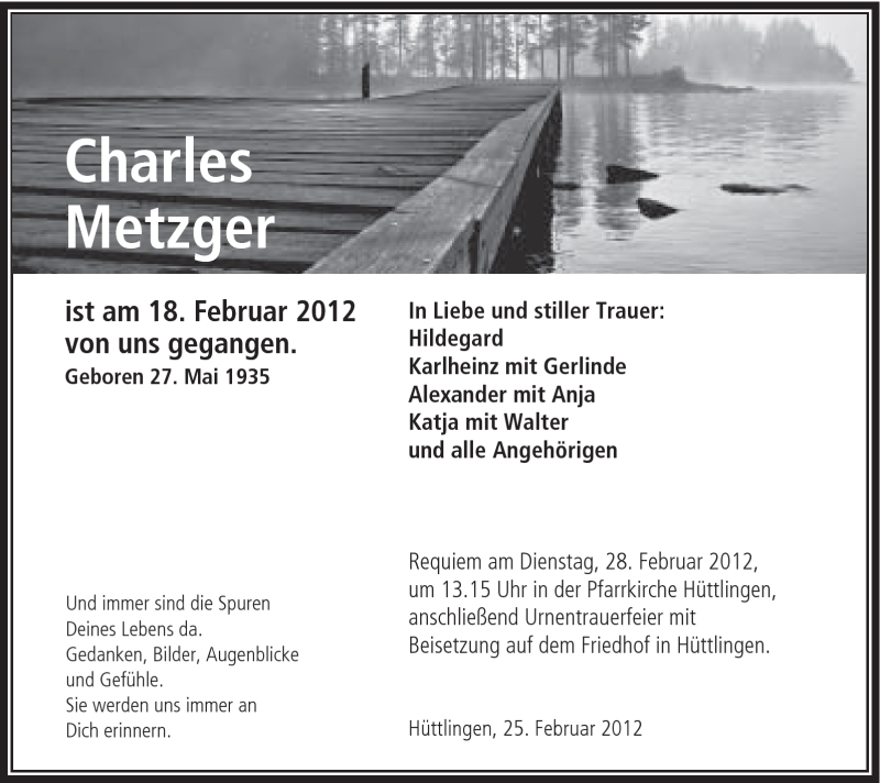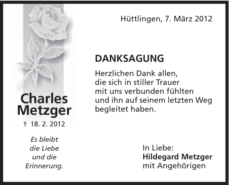 Hier finden Sie alle Traueranzeigen aus der Zeitung, die bisher für Charles Metzger erschienen sind. Weitere Traueranzeigen, die in der Zeitung erscheinen, werden hier ebenfalls aufgelistet