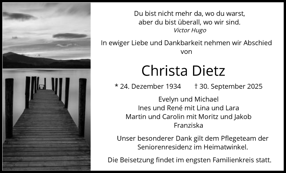 Hier finden Sie alle Traueranzeigen aus der Zeitung, die bisher für Christa Dietz erschienen sind. Weitere Traueranzeigen, die in der Zeitung erscheinen, werden hier ebenfalls aufgelistet