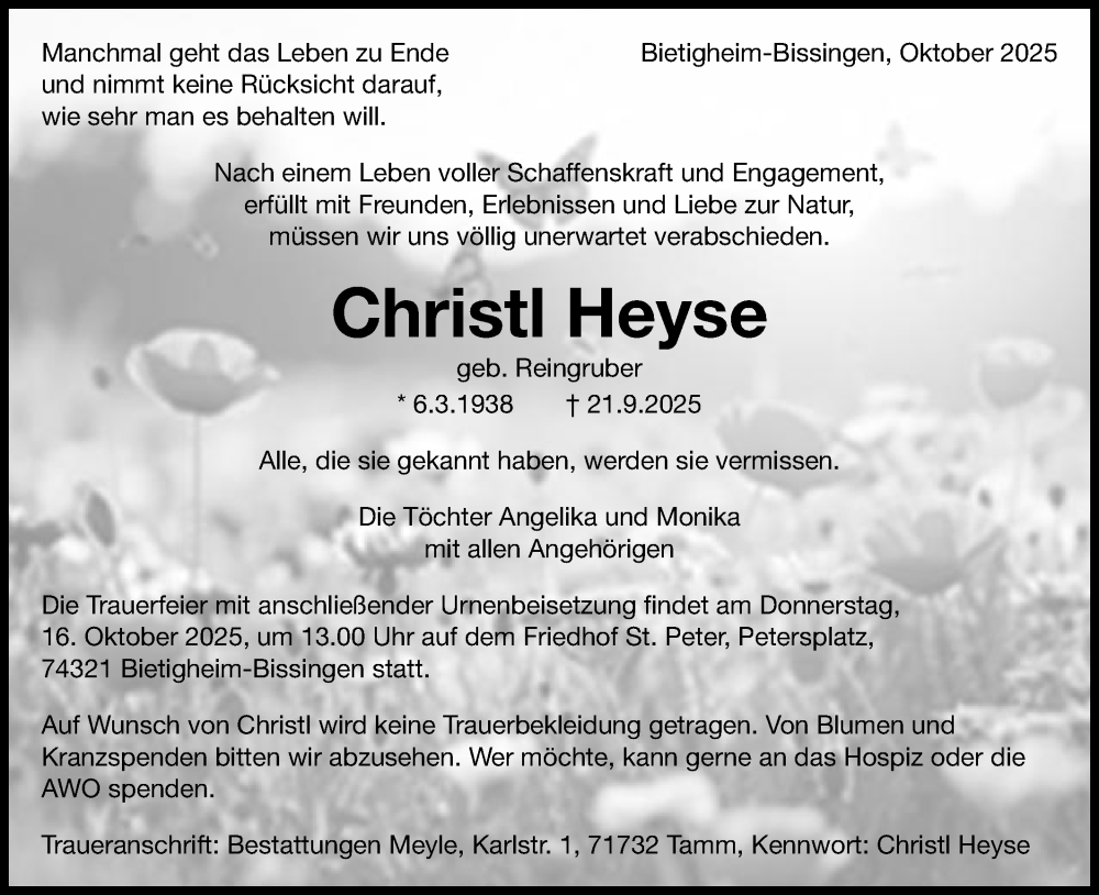 Hier finden Sie alle Traueranzeigen aus der Zeitung, die bisher für Christl Heyse erschienen sind. Weitere Traueranzeigen, die in der Zeitung erscheinen, werden hier ebenfalls aufgelistet