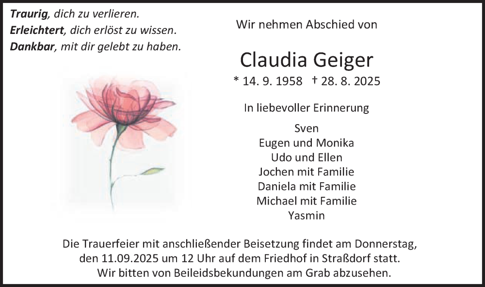 Hier finden Sie alle Traueranzeigen aus der Zeitung, die bisher für Claudia Geiger erschienen sind. Weitere Traueranzeigen, die in der Zeitung erscheinen, werden hier ebenfalls aufgelistet