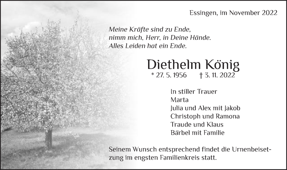 Hier finden Sie alle Traueranzeigen aus der Zeitung, die bisher für Diethelm König erschienen sind. Weitere Traueranzeigen, die in der Zeitung erscheinen, werden hier ebenfalls aufgelistet