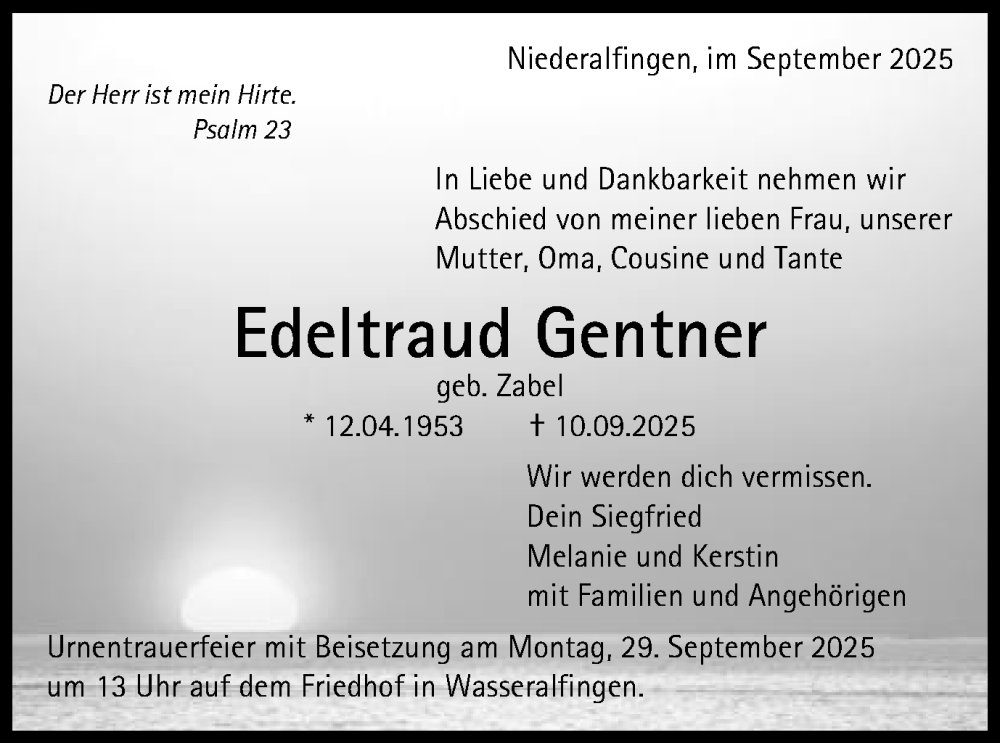 Hier finden Sie alle Traueranzeigen aus der Zeitung, die bisher für Edeltraud Gentner erschienen sind. Weitere Traueranzeigen, die in der Zeitung erscheinen, werden hier ebenfalls aufgelistet