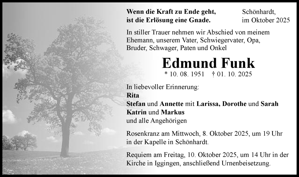 Hier finden Sie alle Traueranzeigen aus der Zeitung, die bisher für Edmund Funk erschienen sind. Weitere Traueranzeigen, die in der Zeitung erscheinen, werden hier ebenfalls aufgelistet