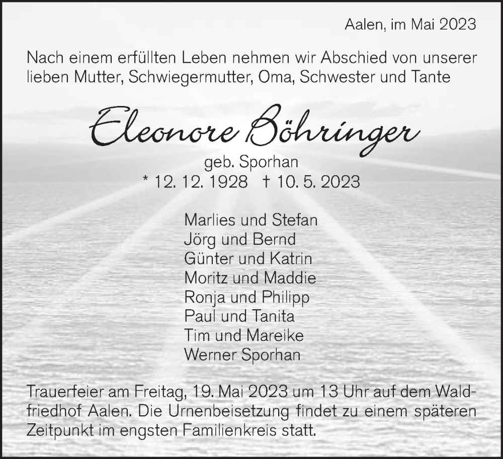 Hier finden Sie alle Traueranzeigen aus der Zeitung, die bisher für Eleonore Böhringer erschienen sind. Weitere Traueranzeigen, die in der Zeitung erscheinen, werden hier ebenfalls aufgelistet