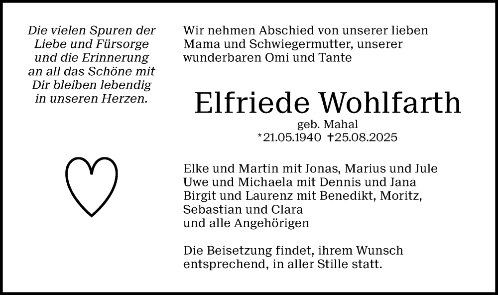 Hier finden Sie alle Traueranzeigen aus der Zeitung, die bisher für Elfriede Wohlfarth erschienen sind. Weitere Traueranzeigen, die in der Zeitung erscheinen, werden hier ebenfalls aufgelistet