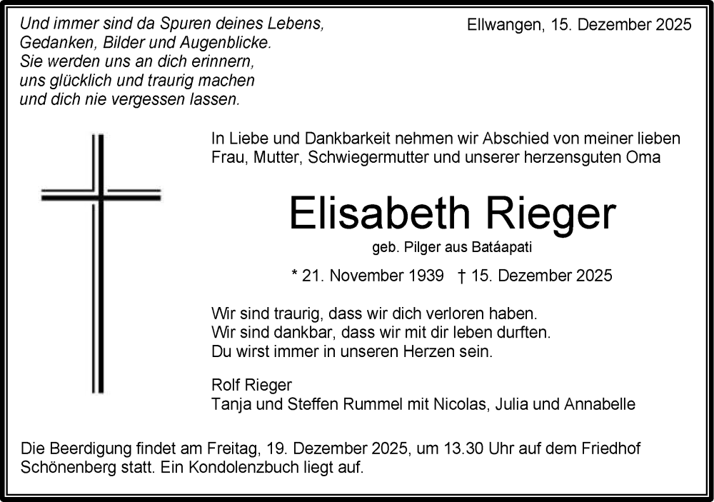 Hier finden Sie alle Traueranzeigen aus der Zeitung, die bisher für Elisabeth Rieger erschienen sind. Weitere Traueranzeigen, die in der Zeitung erscheinen, werden hier ebenfalls aufgelistet