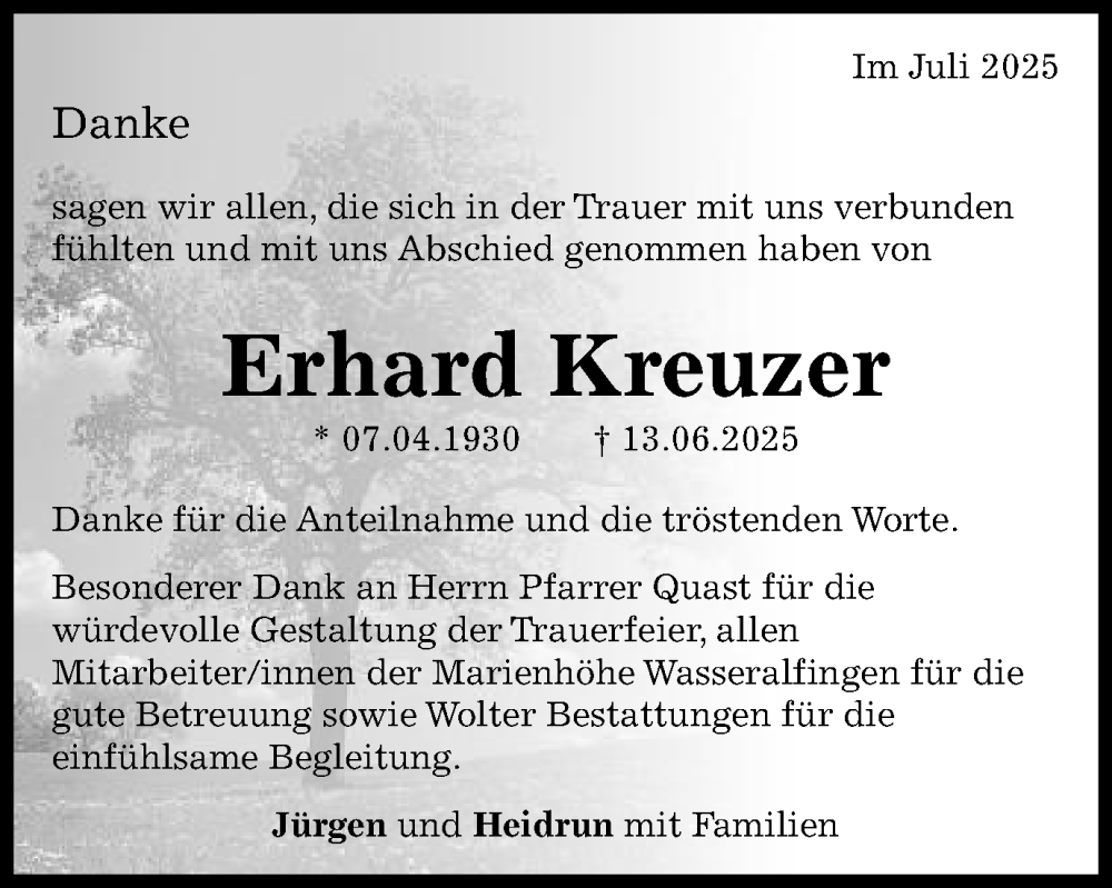 Hier finden Sie alle Traueranzeigen aus der Zeitung, die bisher für Erhard Kreuzer erschienen sind. Weitere Traueranzeigen, die in der Zeitung erscheinen, werden hier ebenfalls aufgelistet