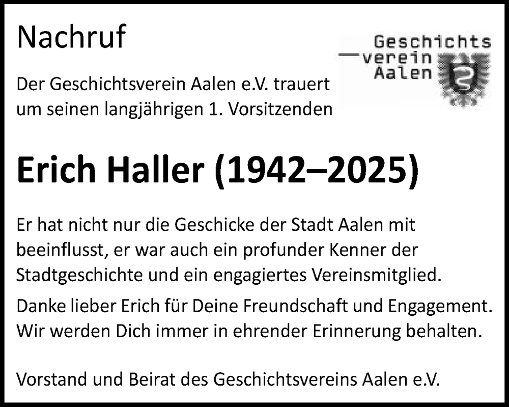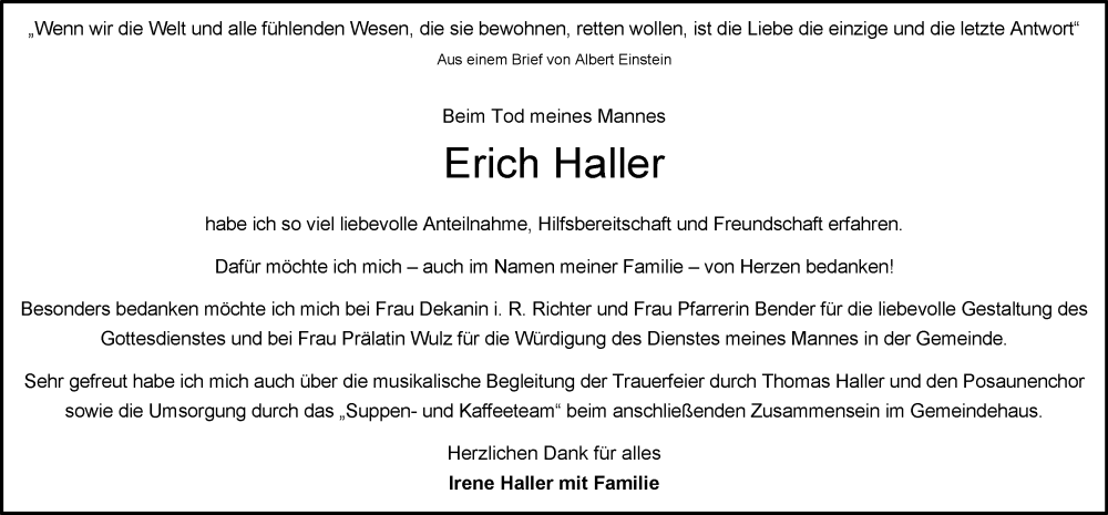 Hier finden Sie alle Traueranzeigen aus der Zeitung, die bisher für Erich Haller erschienen sind. Weitere Traueranzeigen, die in der Zeitung erscheinen, werden hier ebenfalls aufgelistet