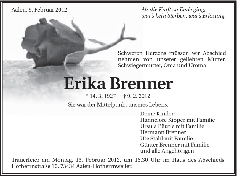 Hier finden Sie alle Traueranzeigen aus der Zeitung, die bisher für Erika Brenner erschienen sind. Weitere Traueranzeigen, die in der Zeitung erscheinen, werden hier ebenfalls aufgelistet