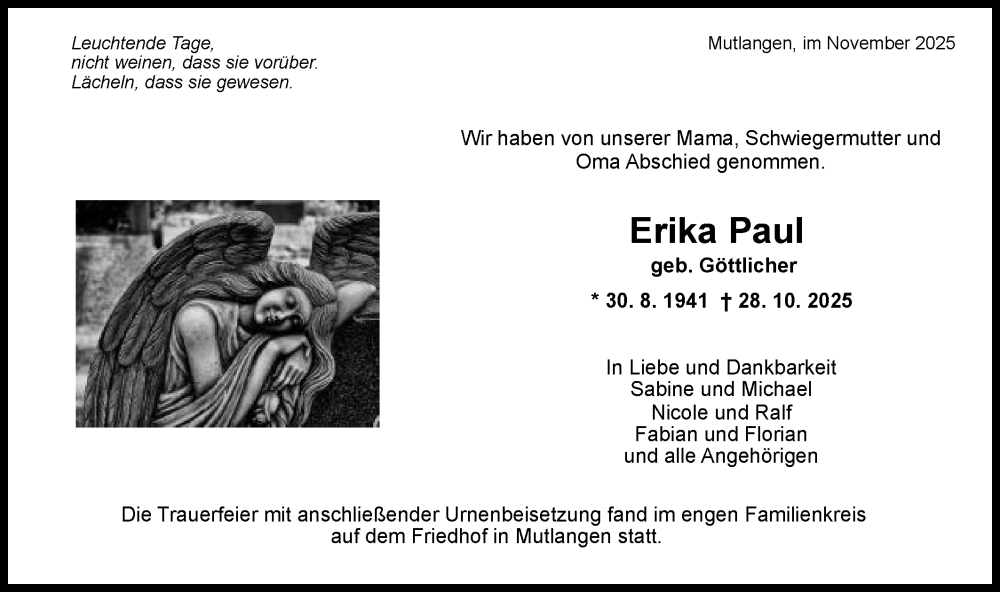 Hier finden Sie alle Traueranzeigen aus der Zeitung, die bisher für Erika Paul erschienen sind. Weitere Traueranzeigen, die in der Zeitung erscheinen, werden hier ebenfalls aufgelistet