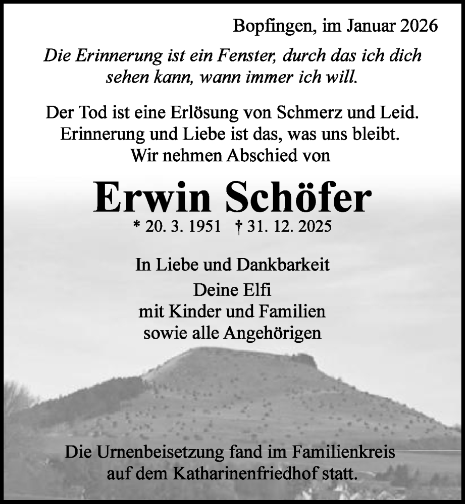 Hier finden Sie alle Traueranzeigen aus der Zeitung, die bisher für Erwin Schöfer erschienen sind. Weitere Traueranzeigen, die in der Zeitung erscheinen, werden hier ebenfalls aufgelistet