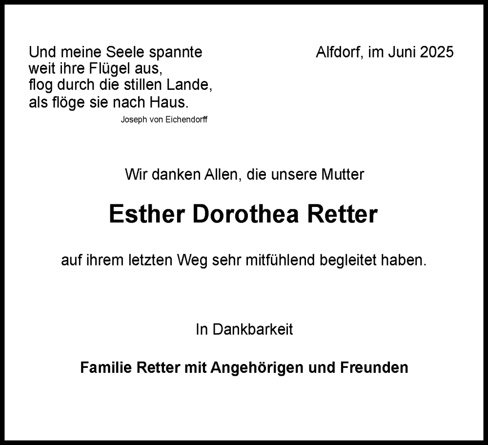 Hier finden Sie alle Traueranzeigen aus der Zeitung, die bisher für Esther Dorothea Retter erschienen sind. Weitere Traueranzeigen, die in der Zeitung erscheinen, werden hier ebenfalls aufgelistet