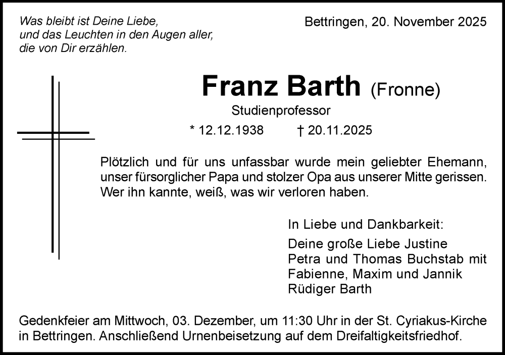 Hier finden Sie alle Traueranzeigen aus der Zeitung, die bisher für Franz Barth erschienen sind. Weitere Traueranzeigen, die in der Zeitung erscheinen, werden hier ebenfalls aufgelistet