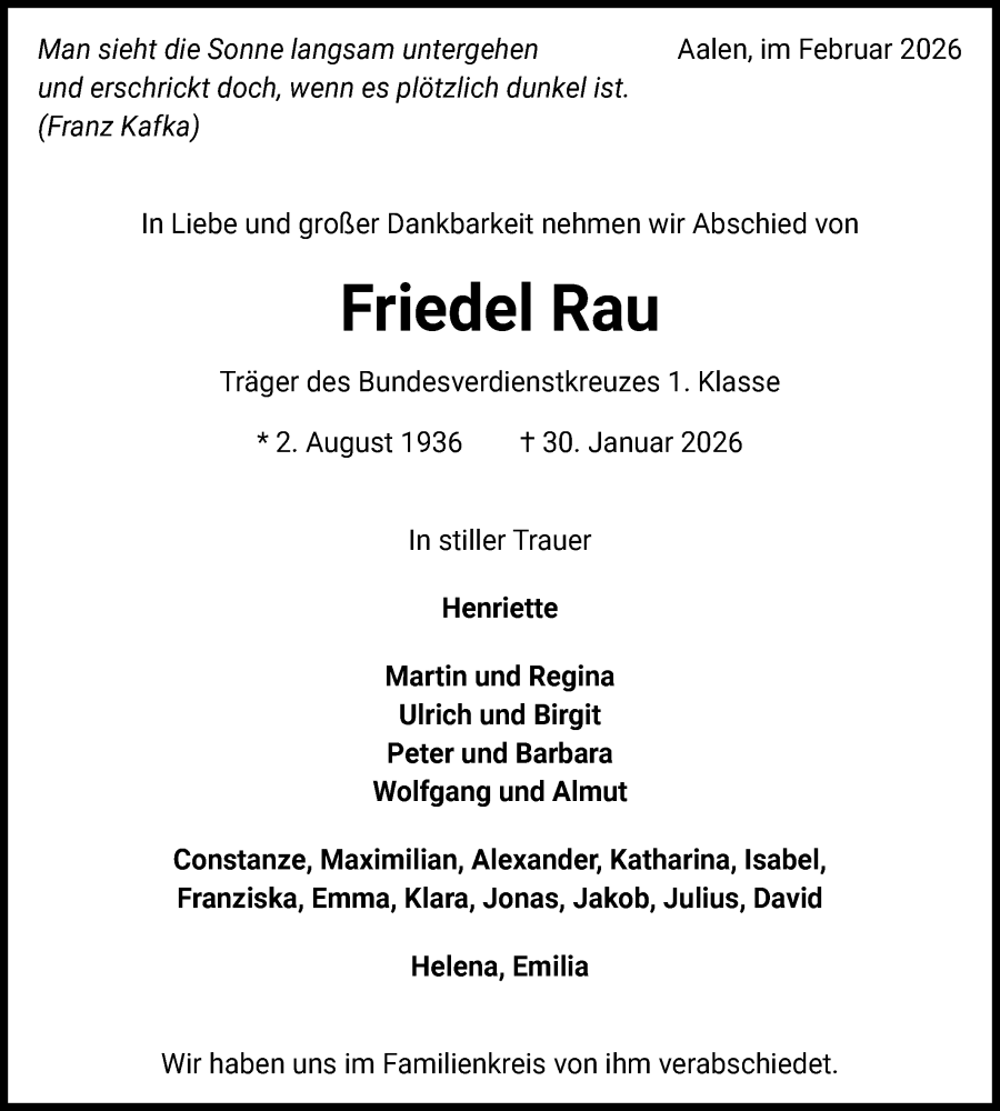 Hier finden Sie alle Traueranzeigen aus der Zeitung, die bisher für Friedel Rau erschienen sind. Weitere Traueranzeigen, die in der Zeitung erscheinen, werden hier ebenfalls aufgelistet