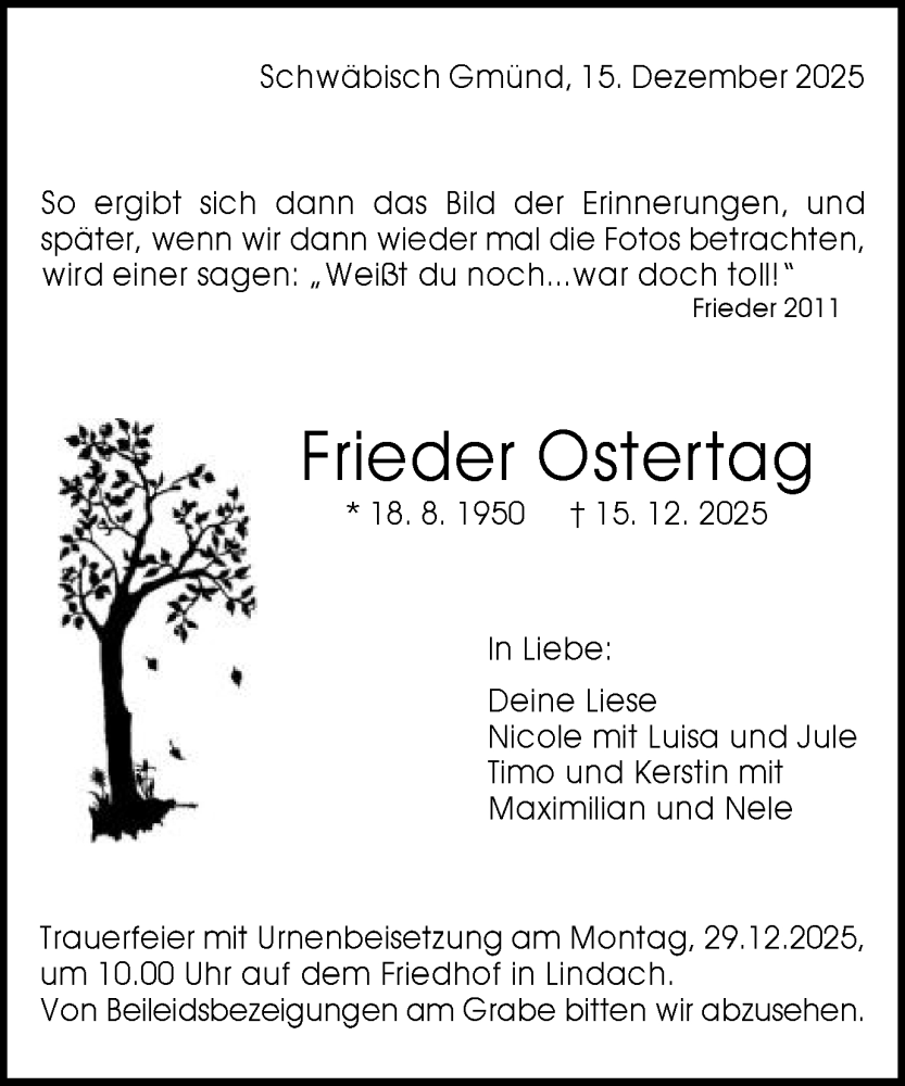 Hier finden Sie alle Traueranzeigen aus der Zeitung, die bisher für Frieder Ostertag erschienen sind. Weitere Traueranzeigen, die in der Zeitung erscheinen, werden hier ebenfalls aufgelistet