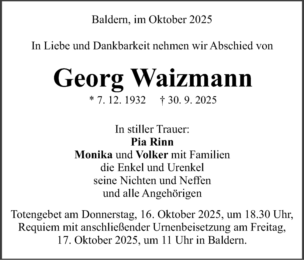 Hier finden Sie alle Traueranzeigen aus der Zeitung, die bisher für Georg Waizmann erschienen sind. Weitere Traueranzeigen, die in der Zeitung erscheinen, werden hier ebenfalls aufgelistet