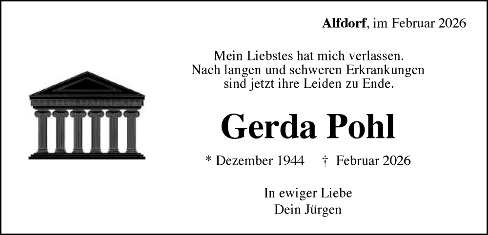 Hier finden Sie alle Traueranzeigen aus der Zeitung, die bisher für Gerda Pohl erschienen sind. Weitere Traueranzeigen, die in der Zeitung erscheinen, werden hier ebenfalls aufgelistet