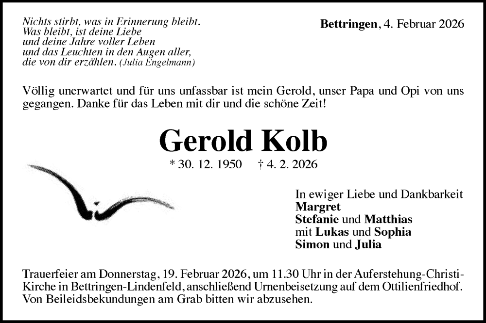 Hier finden Sie alle Traueranzeigen aus der Zeitung, die bisher für Gerold Kolb erschienen sind. Weitere Traueranzeigen, die in der Zeitung erscheinen, werden hier ebenfalls aufgelistet