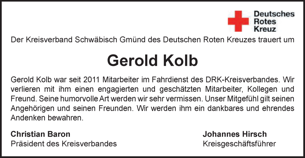 Hier finden Sie alle Traueranzeigen aus der Zeitung, die bisher für Gerold Kolb erschienen sind. Weitere Traueranzeigen, die in der Zeitung erscheinen, werden hier ebenfalls aufgelistet