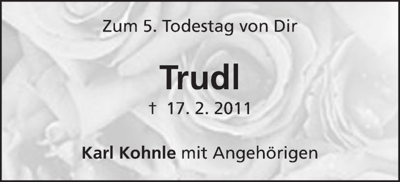 Hier finden Sie alle Traueranzeigen aus der Zeitung, die bisher für Gertrud Kohnle erschienen sind. Weitere Traueranzeigen, die in der Zeitung erscheinen, werden hier ebenfalls aufgelistet