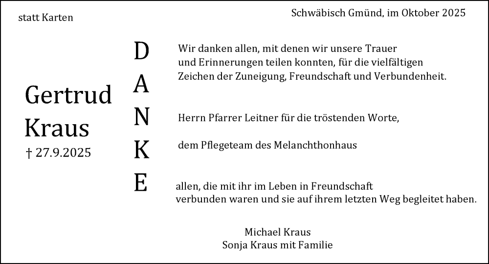 Hier finden Sie alle Traueranzeigen aus der Zeitung, die bisher für Gertrud Kraus erschienen sind. Weitere Traueranzeigen, die in der Zeitung erscheinen, werden hier ebenfalls aufgelistet