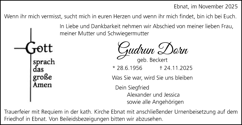 Hier finden Sie alle Traueranzeigen aus der Zeitung, die bisher für Gudrun Dorn erschienen sind. Weitere Traueranzeigen, die in der Zeitung erscheinen, werden hier ebenfalls aufgelistet