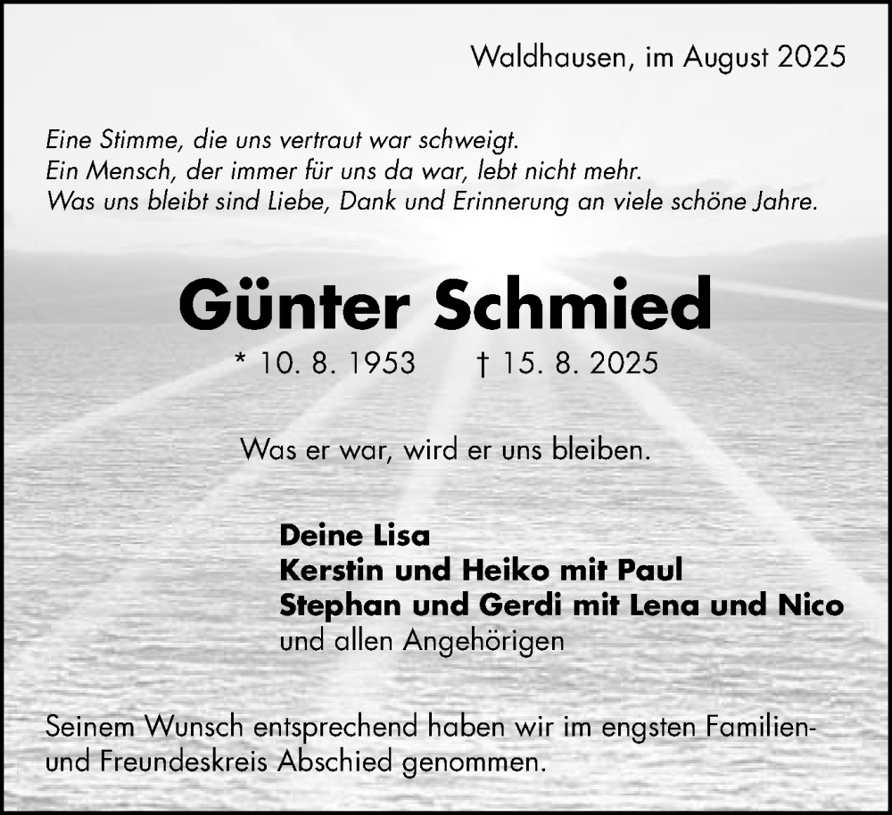 Hier finden Sie alle Traueranzeigen aus der Zeitung, die bisher für Günter Schmied erschienen sind. Weitere Traueranzeigen, die in der Zeitung erscheinen, werden hier ebenfalls aufgelistet