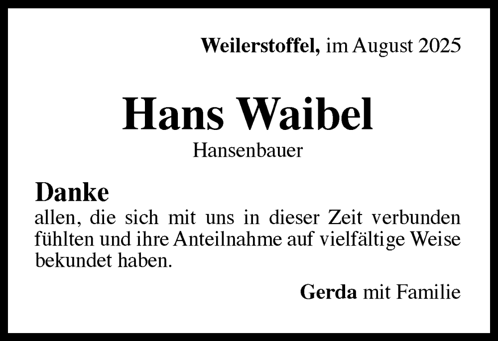 Hier finden Sie alle Traueranzeigen aus der Zeitung, die bisher für Hans Waibel erschienen sind. Weitere Traueranzeigen, die in der Zeitung erscheinen, werden hier ebenfalls aufgelistet
