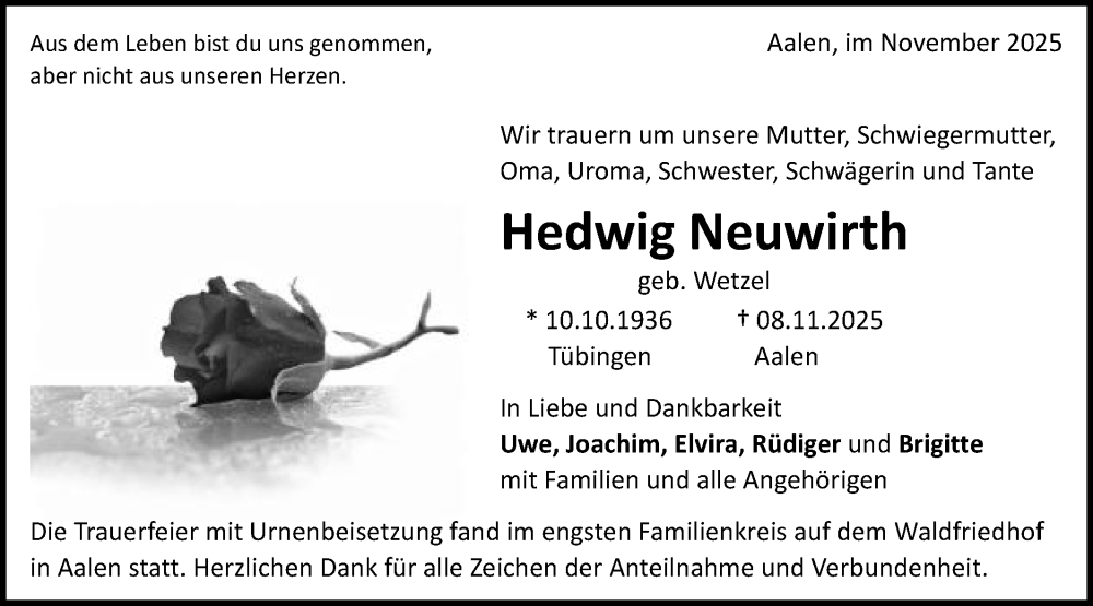 Hier finden Sie alle Traueranzeigen aus der Zeitung, die bisher für Hedwig Neuwirth erschienen sind. Weitere Traueranzeigen, die in der Zeitung erscheinen, werden hier ebenfalls aufgelistet