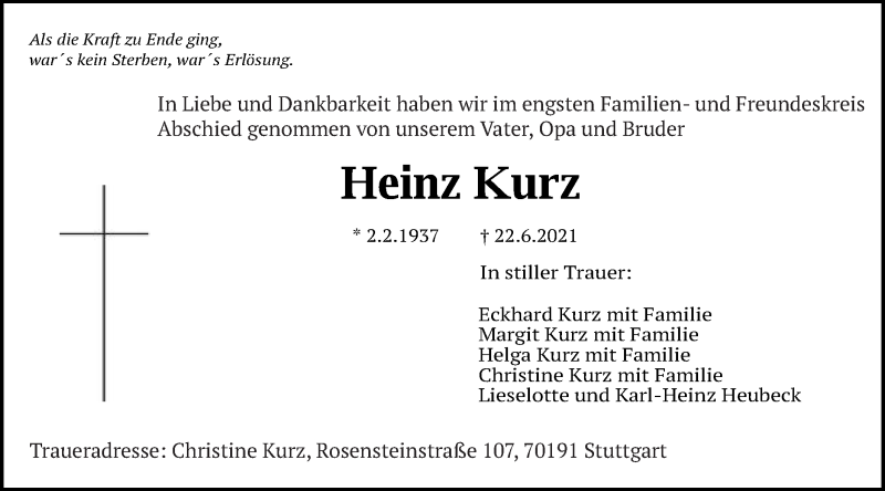 Hier finden Sie alle Traueranzeigen aus der Zeitung, die bisher für Heinz Kurz erschienen sind. Weitere Traueranzeigen, die in der Zeitung erscheinen, werden hier ebenfalls aufgelistet