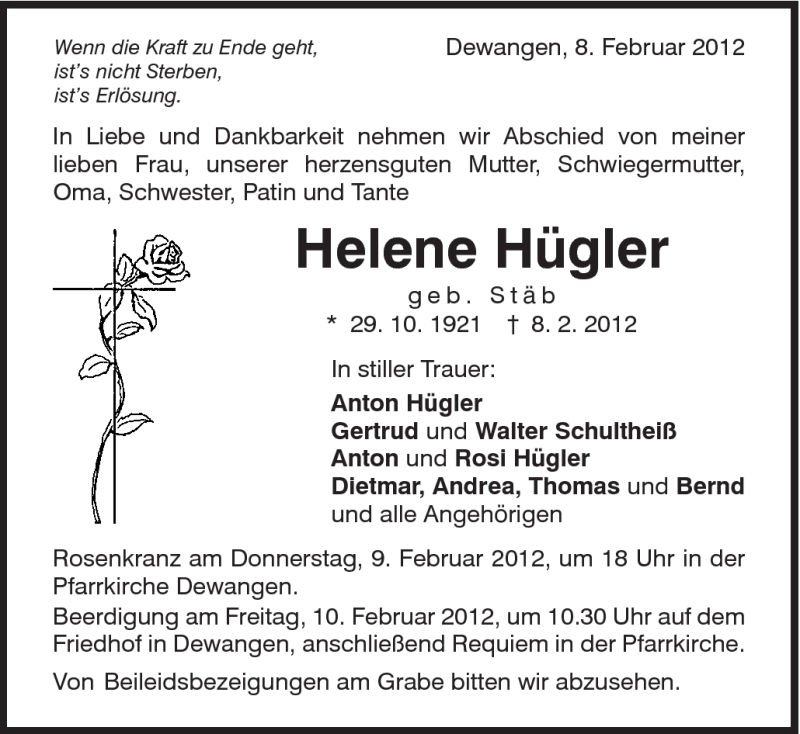 Hier finden Sie alle Traueranzeigen aus der Zeitung, die bisher für Helene Hügler erschienen sind. Weitere Traueranzeigen, die in der Zeitung erscheinen, werden hier ebenfalls aufgelistet