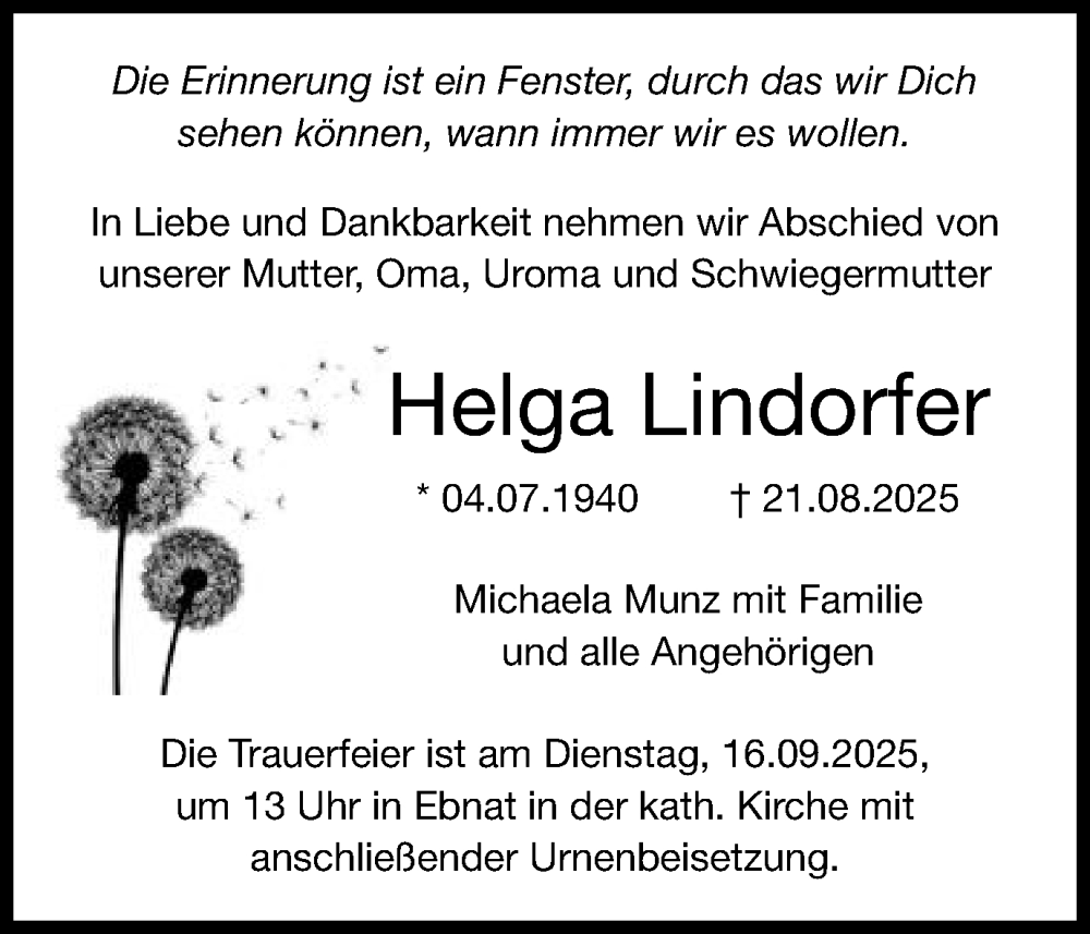 Hier finden Sie alle Traueranzeigen aus der Zeitung, die bisher für Helga Lindorfer erschienen sind. Weitere Traueranzeigen, die in der Zeitung erscheinen, werden hier ebenfalls aufgelistet