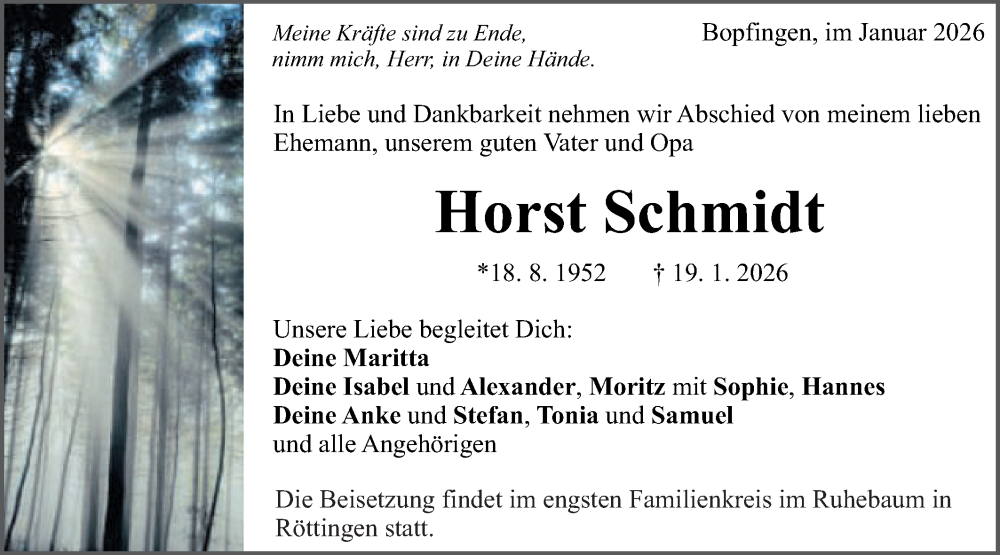 Hier finden Sie alle Traueranzeigen aus der Zeitung, die bisher für Horst Schmidt erschienen sind. Weitere Traueranzeigen, die in der Zeitung erscheinen, werden hier ebenfalls aufgelistet