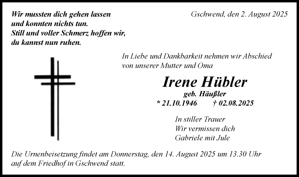 Hier finden Sie alle Traueranzeigen aus der Zeitung, die bisher für Irene Hübler erschienen sind. Weitere Traueranzeigen, die in der Zeitung erscheinen, werden hier ebenfalls aufgelistet