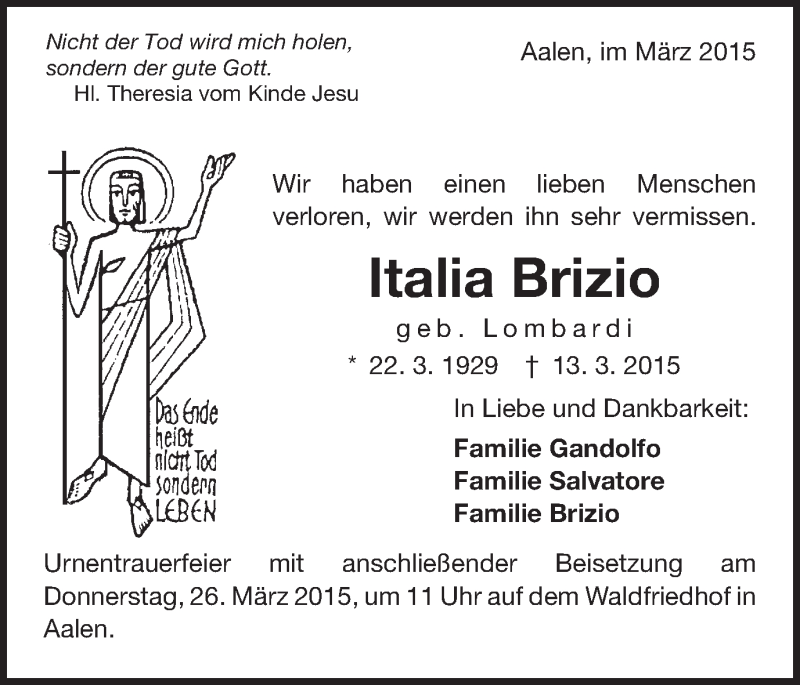 Hier finden Sie alle Traueranzeigen aus der Zeitung, die bisher für Italia Brizio erschienen sind. Weitere Traueranzeigen, die in der Zeitung erscheinen, werden hier ebenfalls aufgelistet