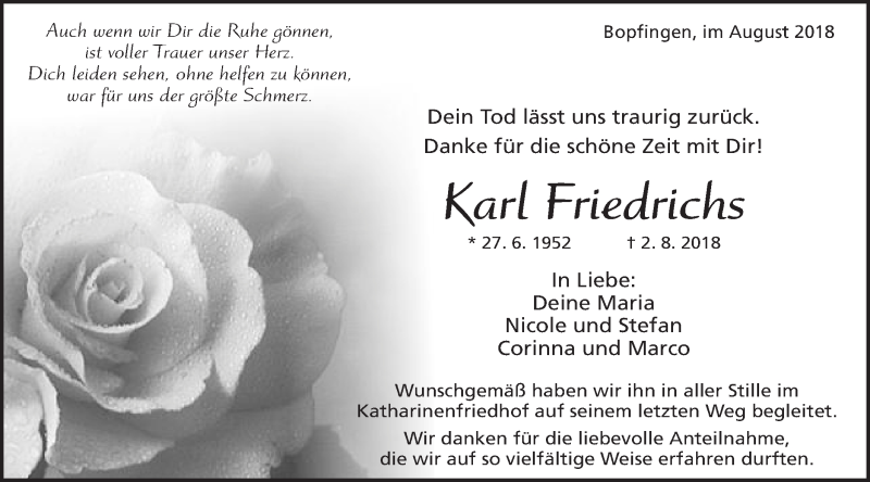 Hier finden Sie alle Traueranzeigen aus der Zeitung, die bisher für Karl Friedrichs erschienen sind. Weitere Traueranzeigen, die in der Zeitung erscheinen, werden hier ebenfalls aufgelistet