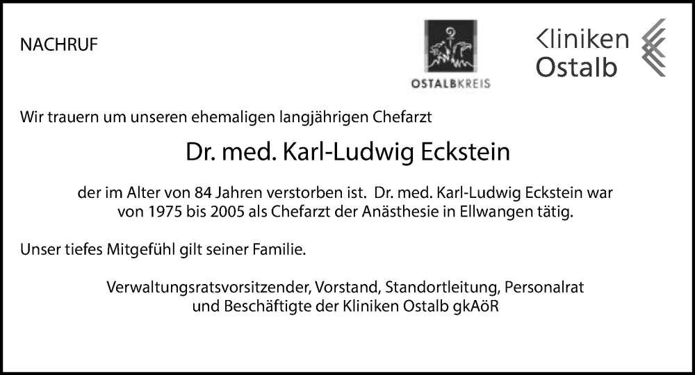 Hier finden Sie alle Traueranzeigen aus der Zeitung, die bisher für Karl-Ludwig Eckstein erschienen sind. Weitere Traueranzeigen, die in der Zeitung erscheinen, werden hier ebenfalls aufgelistet