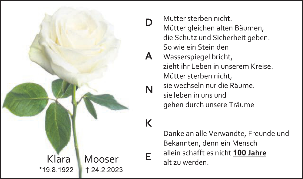 Hier finden Sie alle Traueranzeigen aus der Zeitung, die bisher für Klara Mooser erschienen sind. Weitere Traueranzeigen, die in der Zeitung erscheinen, werden hier ebenfalls aufgelistet